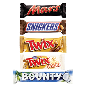 Mars 51g, Snickers e Twix 5og, Twix White 46g e Bounty 57g
