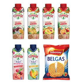 1 Compal Clássico Néctar Maracujá, Pêra Rocha, Pêssego, Tutti Frutti, Compal Vital AOX Frutos vermelhos, Equilíbrio Manga Laranja 300ml + 1 Belgas Original 36g